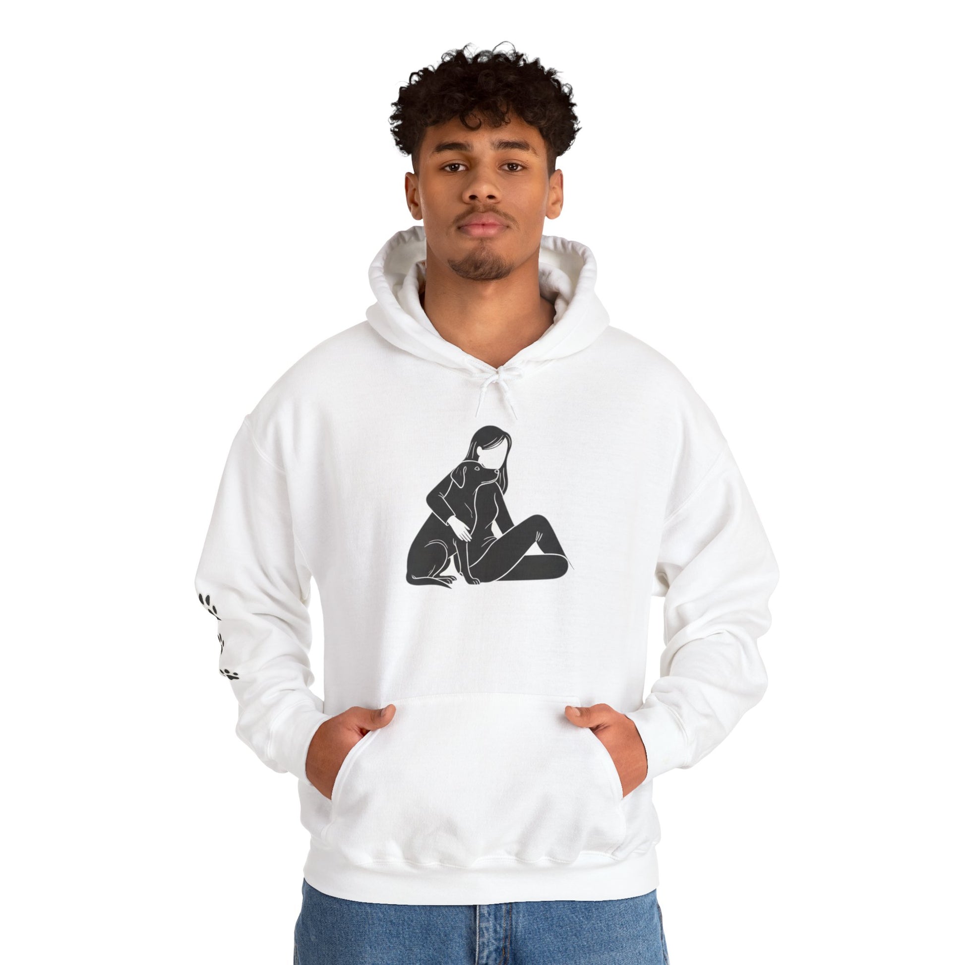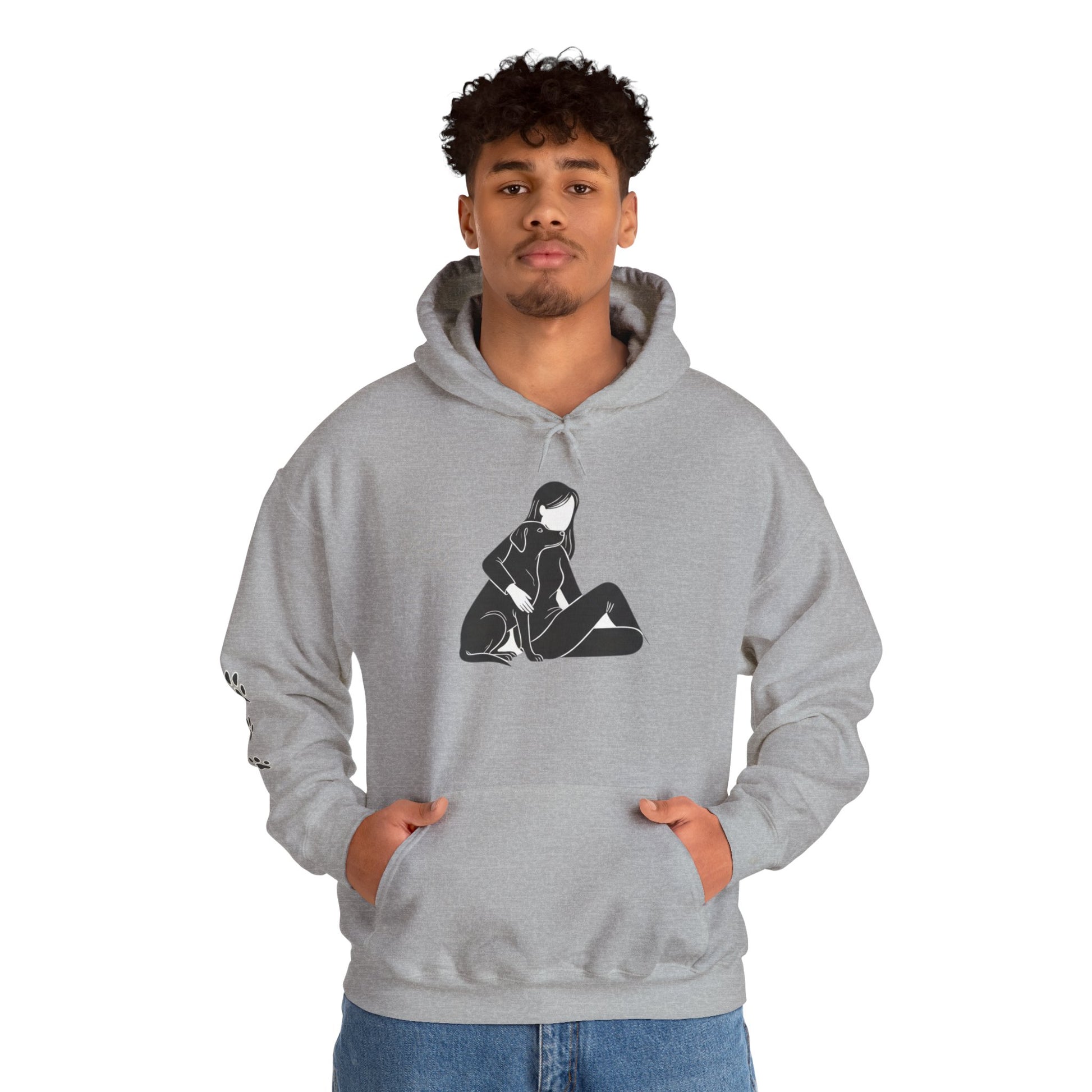 Designed with a minimalist illustration and a calm, balanced composition, this hoodie speaks softly but meaningfully. The monochrome artwork — a relaxed figure with her loyal dog at her side — sits low on the chest, symbolizing companionship, trust, and everyday connection.